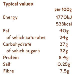 Ingredients: Dried Date Powder, Cocoa Butter, Whole Milk Powder (milk), Cocoa Mass, Chicory Root Fibre (prebiotic), Sunflower Lecithin